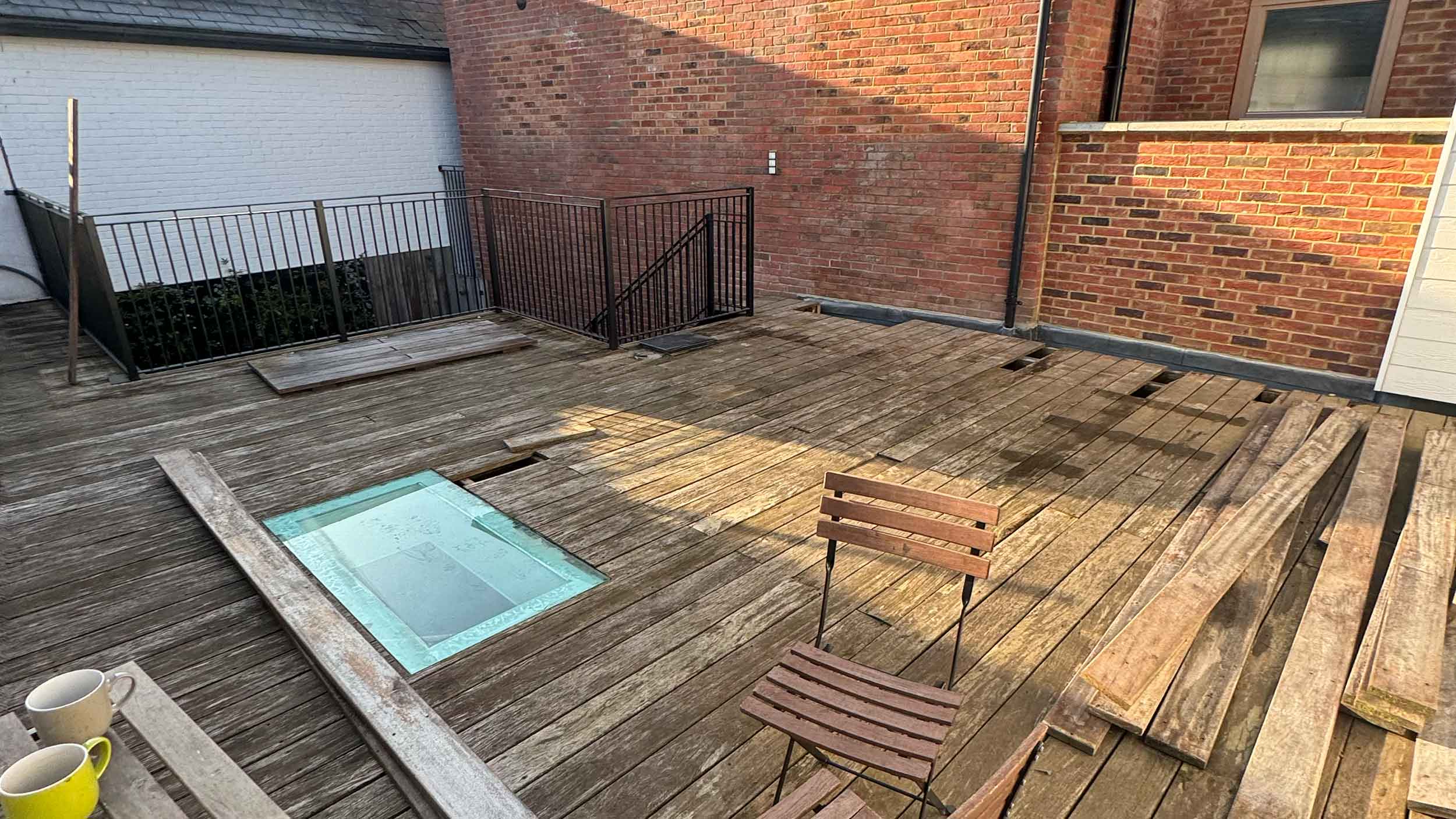 The old rotten decking was carefully removed and replaced with a new design built to withstand the weight of modern materials. Drainage and planting were integrated to transform the large sun trap into a practical, inviting space once again.